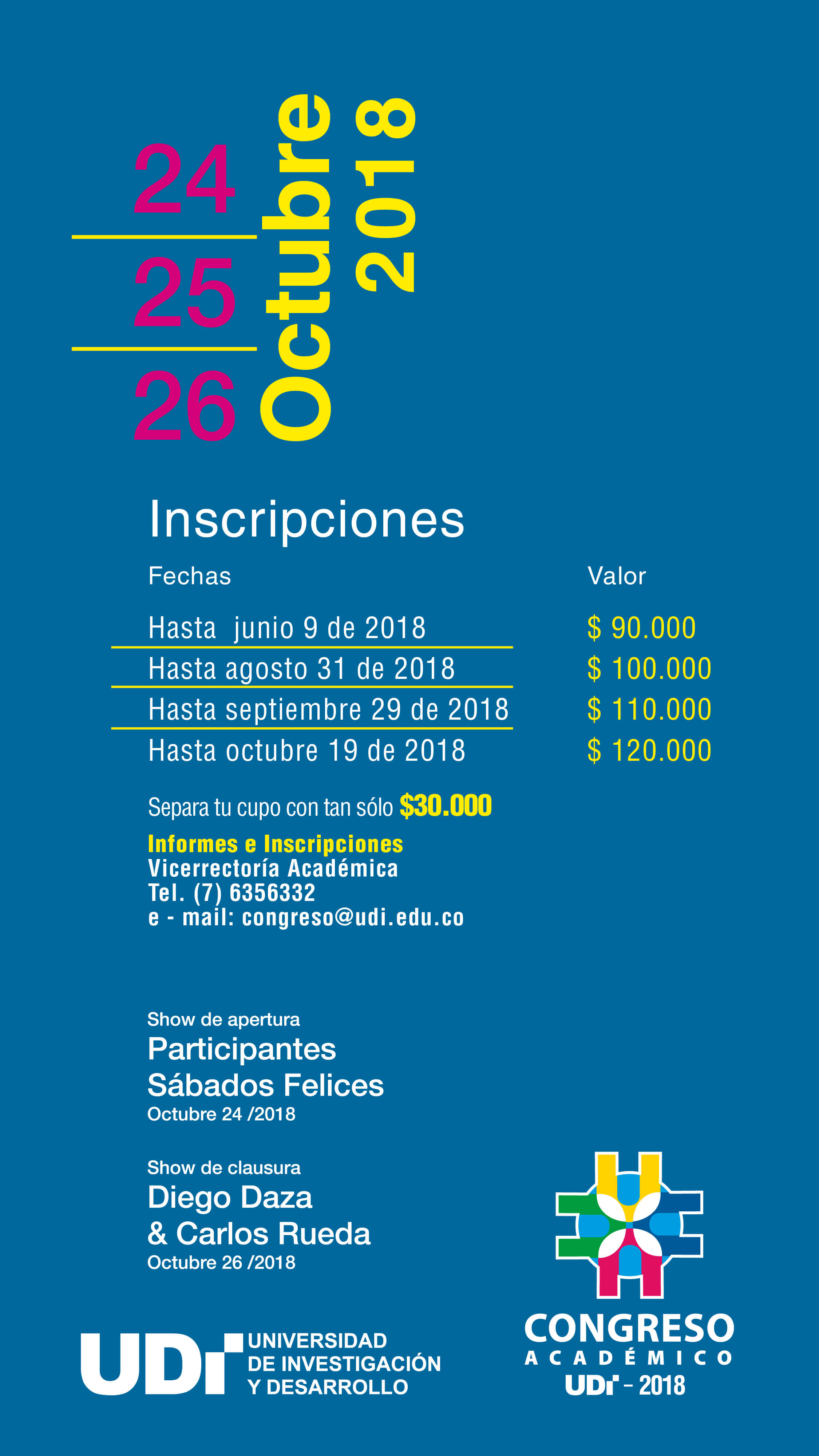 El Congreso Académico UDI es un evento en el que se presentarán ponencias y conferencias magistrales derivadas de la experiencia académica e investigativa de todos los participantes. Se llevará a cabo en las instalaciones de la Universidad de Investigación y Desarrollo - UDI Bucaramanga - Colombia, en la Calle 9 No. 23 - 55, del 23 al 24 de Octubre del 2018.